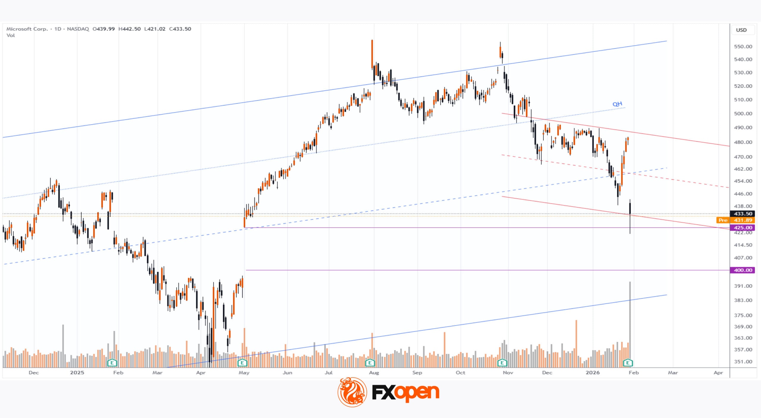 As a result, the initial shock reaction may subside, and MSFT could avoid a further acceleration to the downside. That said, a sustained return to a bullish trend would require clear and compelling fundamental drivers.